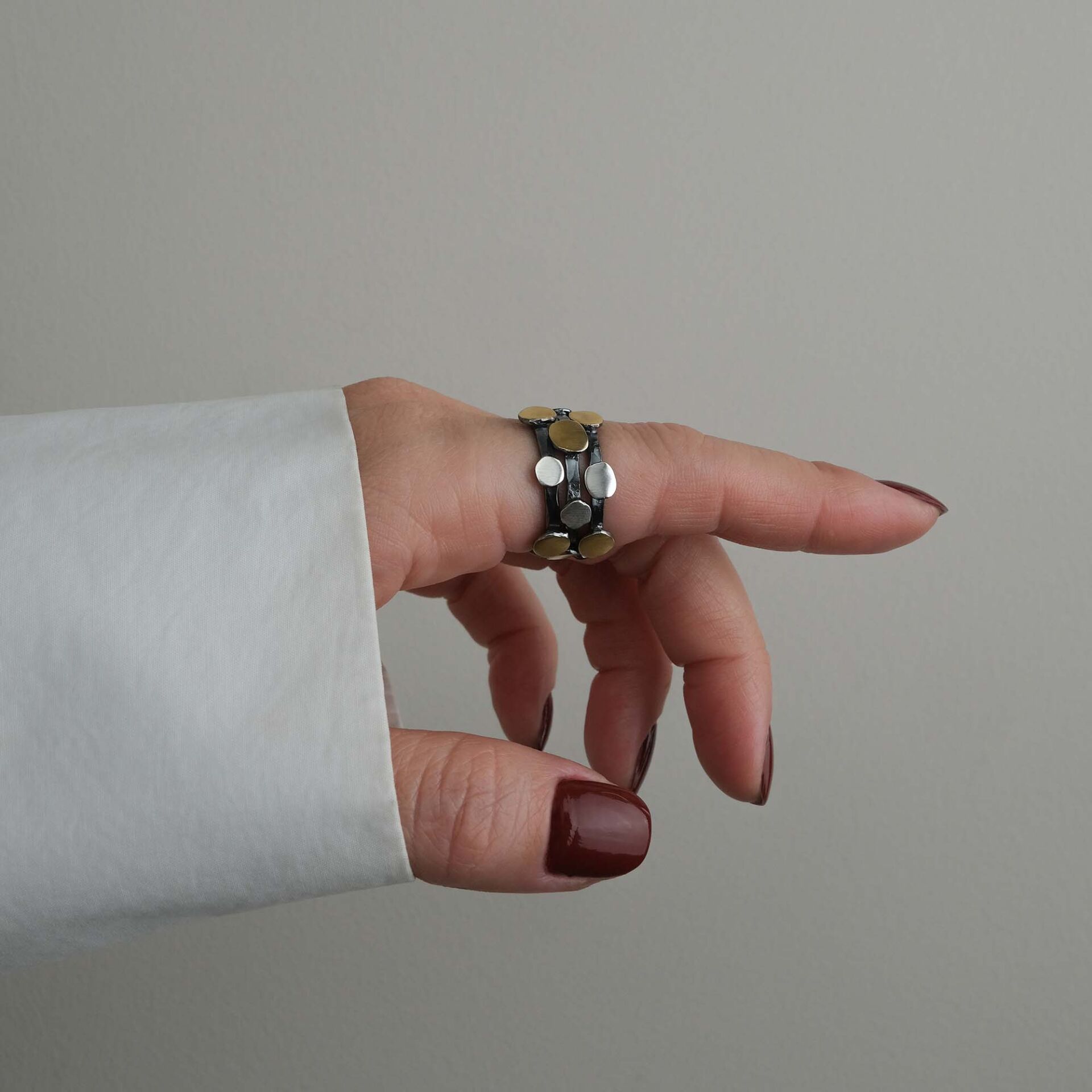 Malzeme: %100 925 ayar gümüş üzeri karartma işlemi uygulanmış, "gold" kısımlarına 18k altın kaplama yapılmıştır.