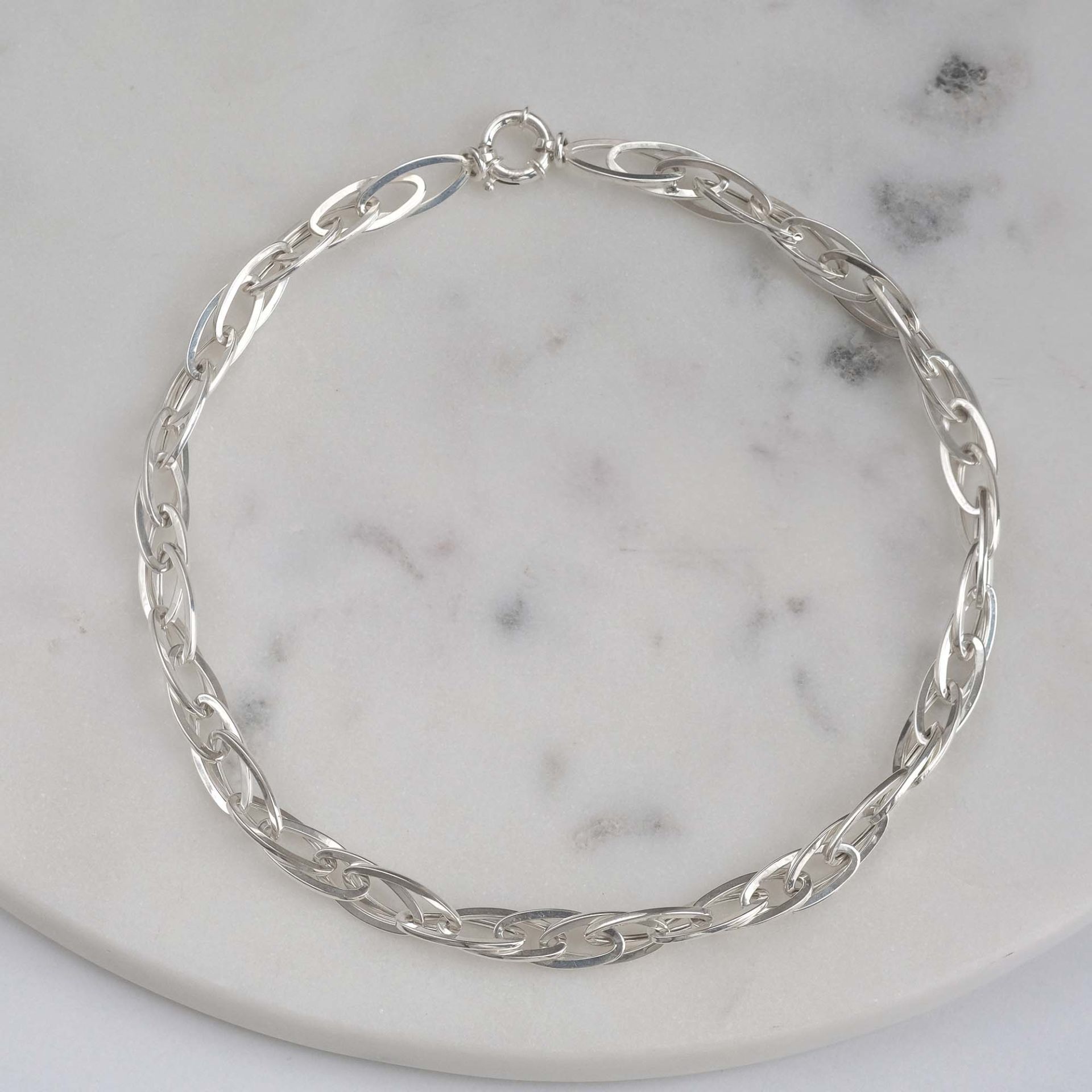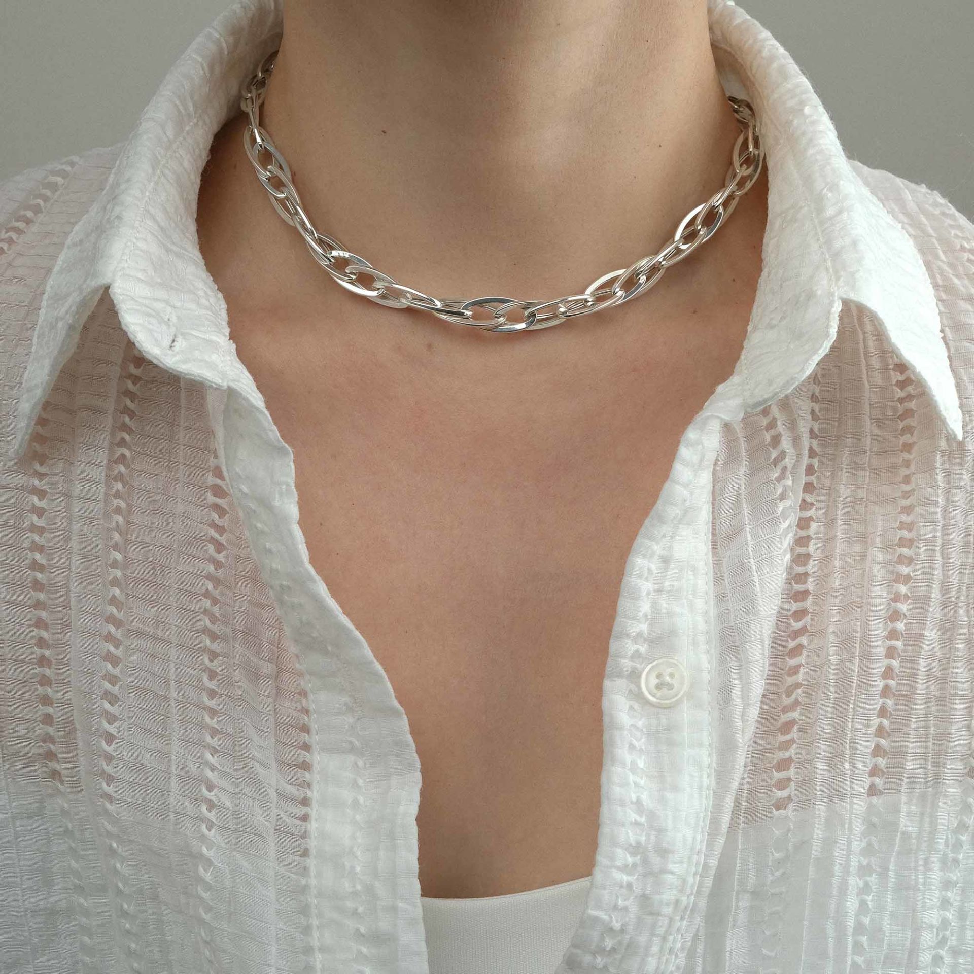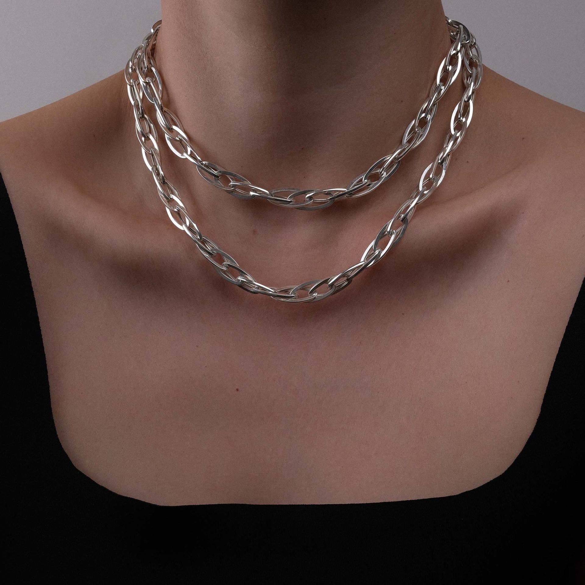Oval ve İç İçe Geçmeli Kalın Zincir Gümüş Kolye, hem günlük şık hem akşam daveti için kullanabileceğiniz modern ve taşsız kolye. Boynunuza parlaklık ve aydınlık katar, çekici kombinler oluşturmanıza yardımcı olur. Zanaatkarlarımız tarafından yüksek kalitede gümüş kullanarak sizin için özenle üretildi.